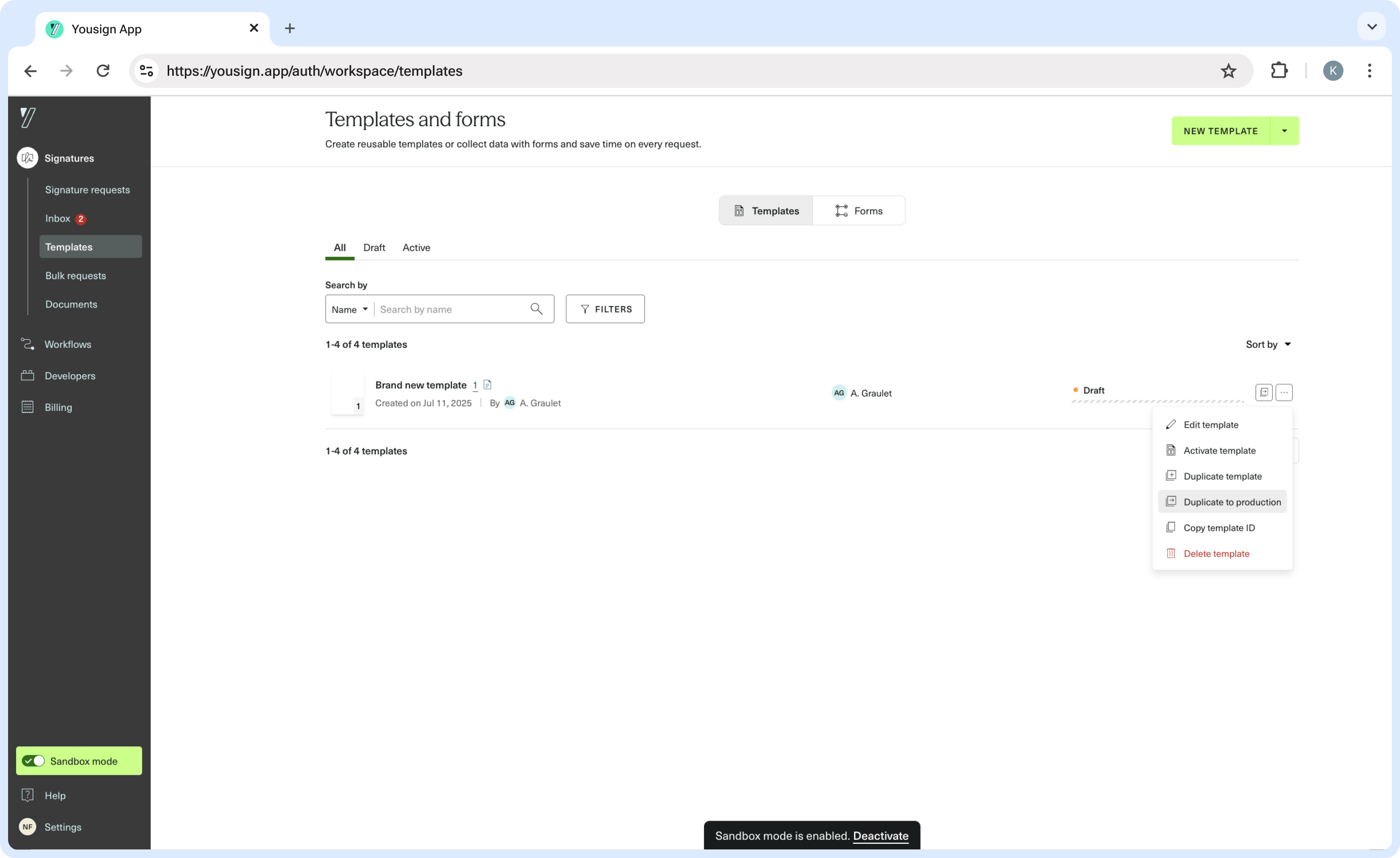 You can now duplicate a Template from the Sandbox environment to Production directly from the Yousign application.