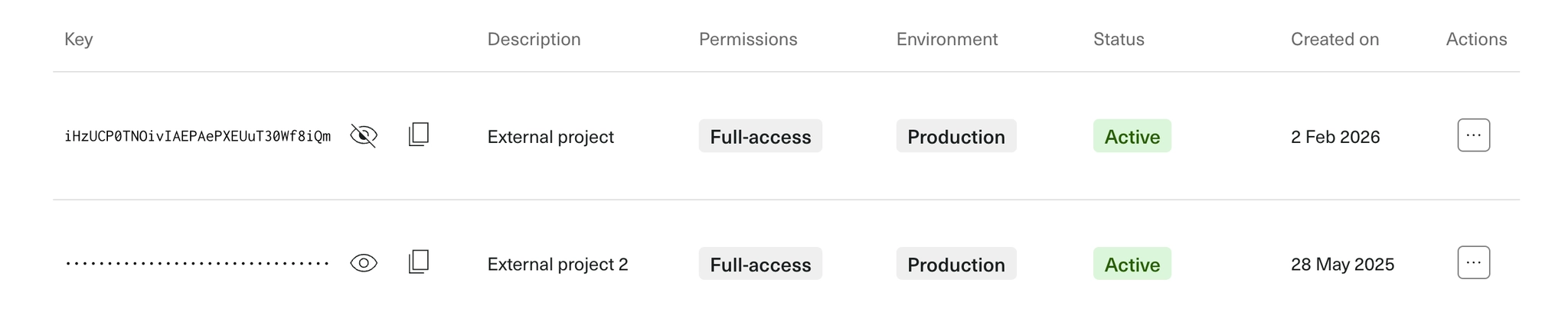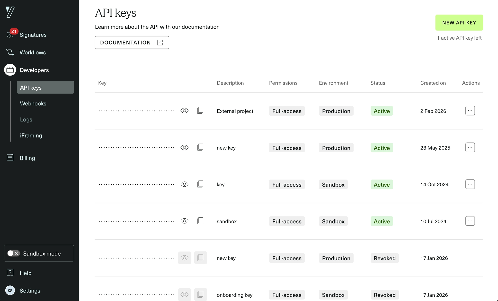 Create, copy, and revoke API keys directly from the API keys page in the Yousign app. This is where you also scope keys to Workspaces and set permissions.