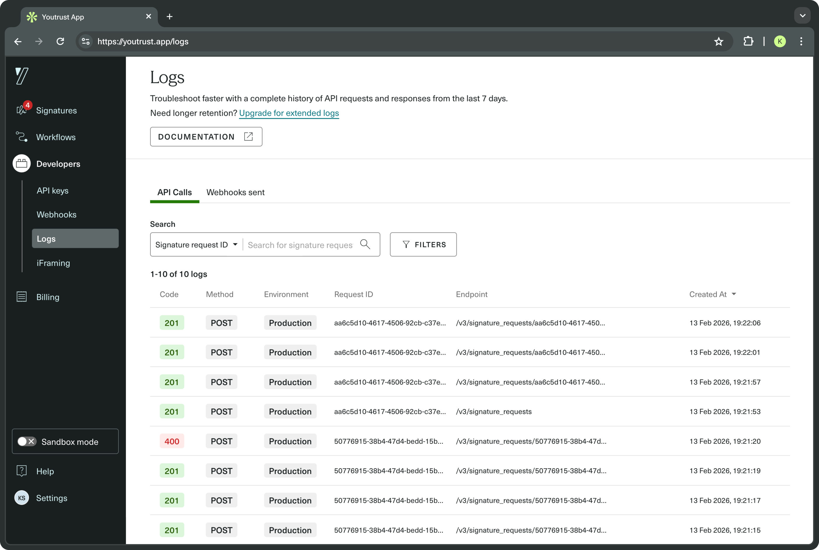 This page provides an overview only. For detailed instructions on using the Logs pages, see our Help Center article: How to use API Logs and Webhooks?