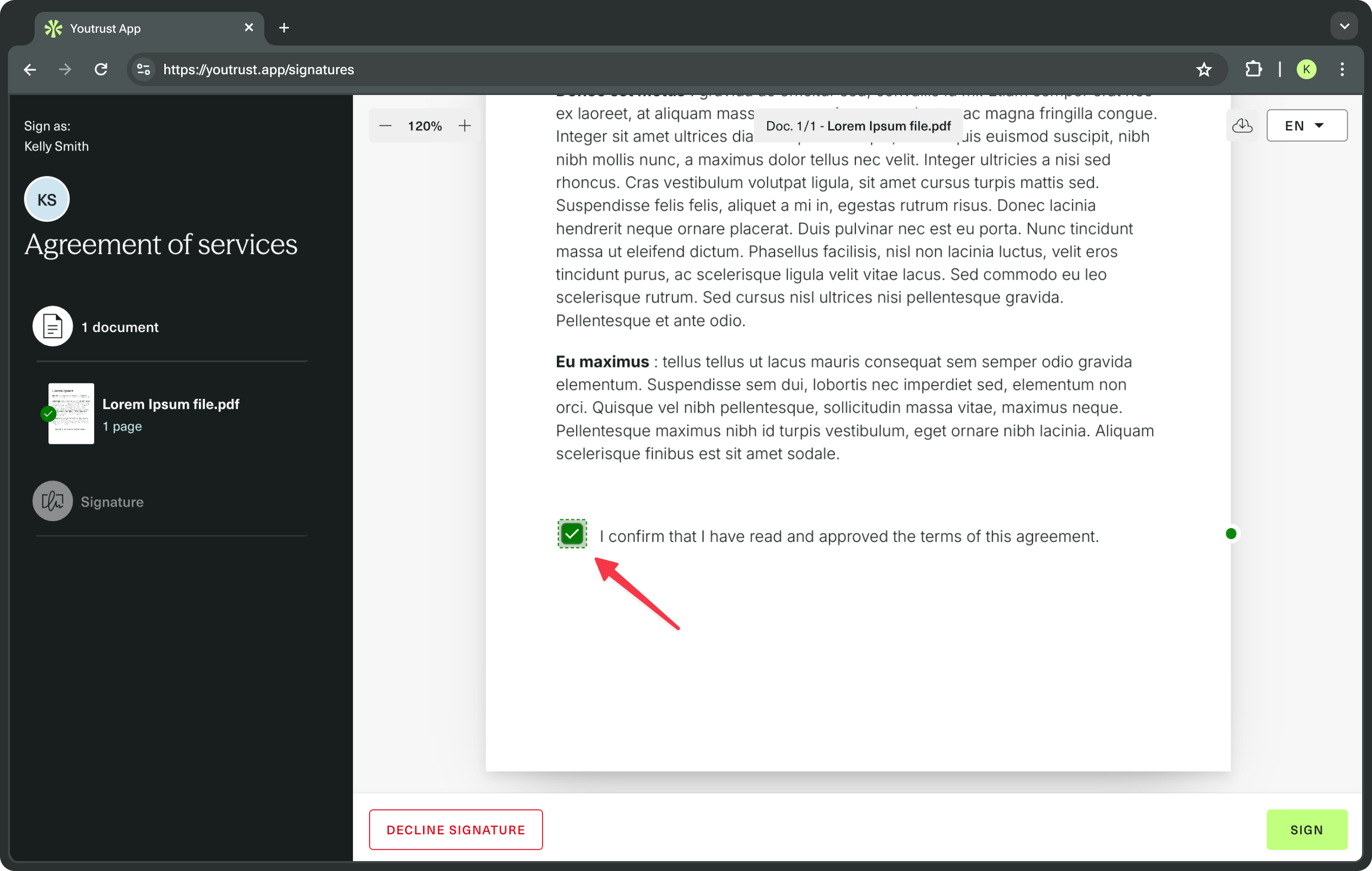 A Checkbox allows Signers to select or deselect an option in a Document.