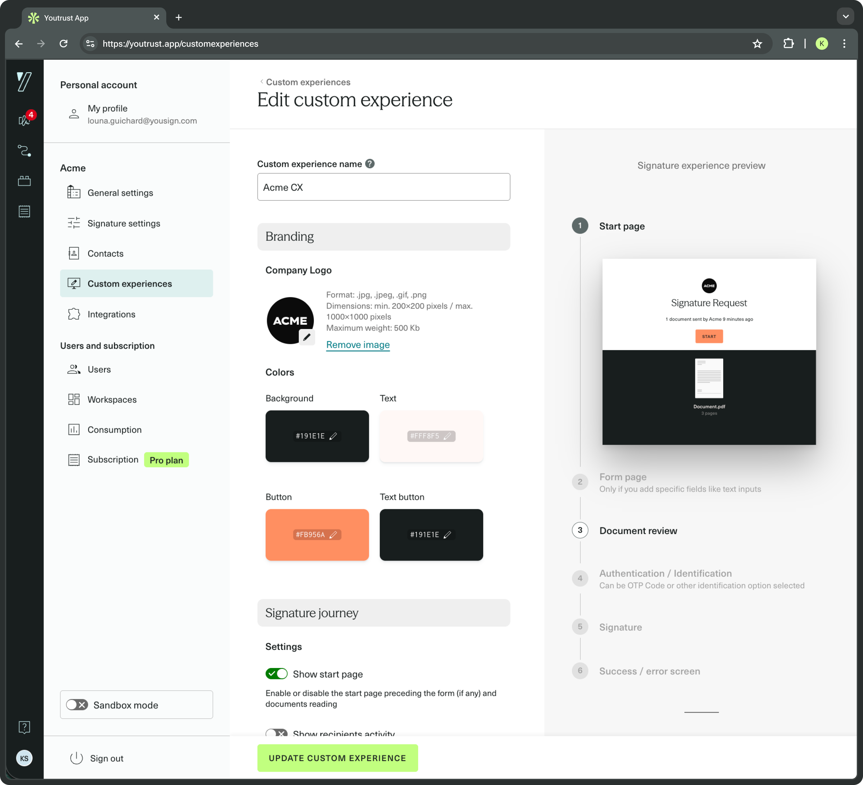 You can customise the look and feel of your signing experience with the Custom Experience feature.