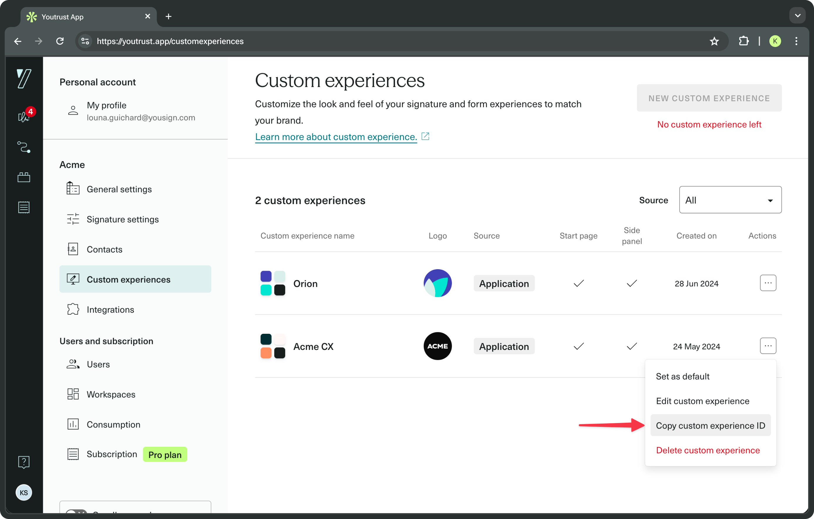 To do so, you must set the custom_experience_id parameter with the customExperienceId when you initiate the Signature Request.