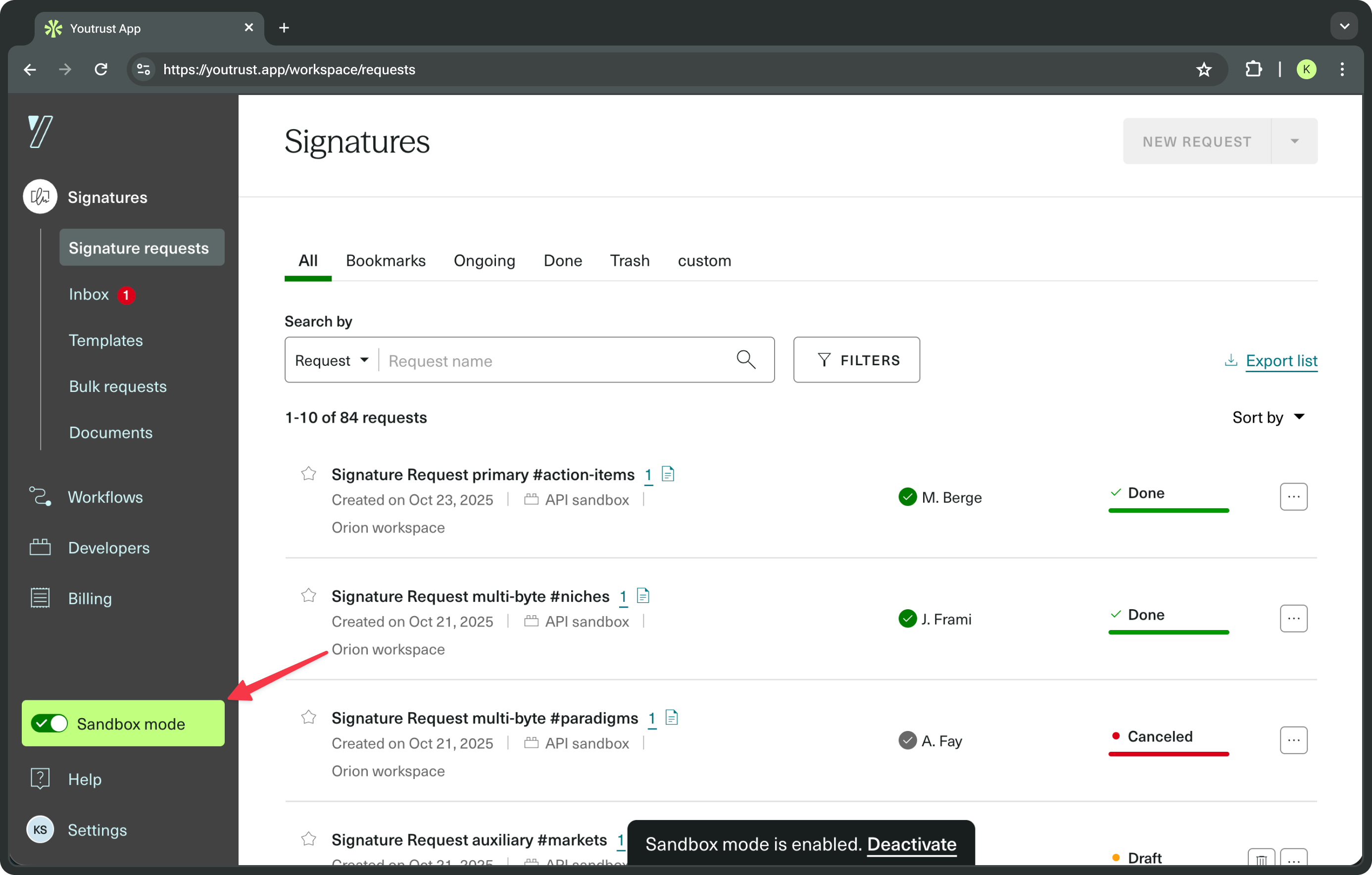 You can access Sandbox ressources in the Yousign Application by toggling the Sandbox mode switch in the left-hand menu.