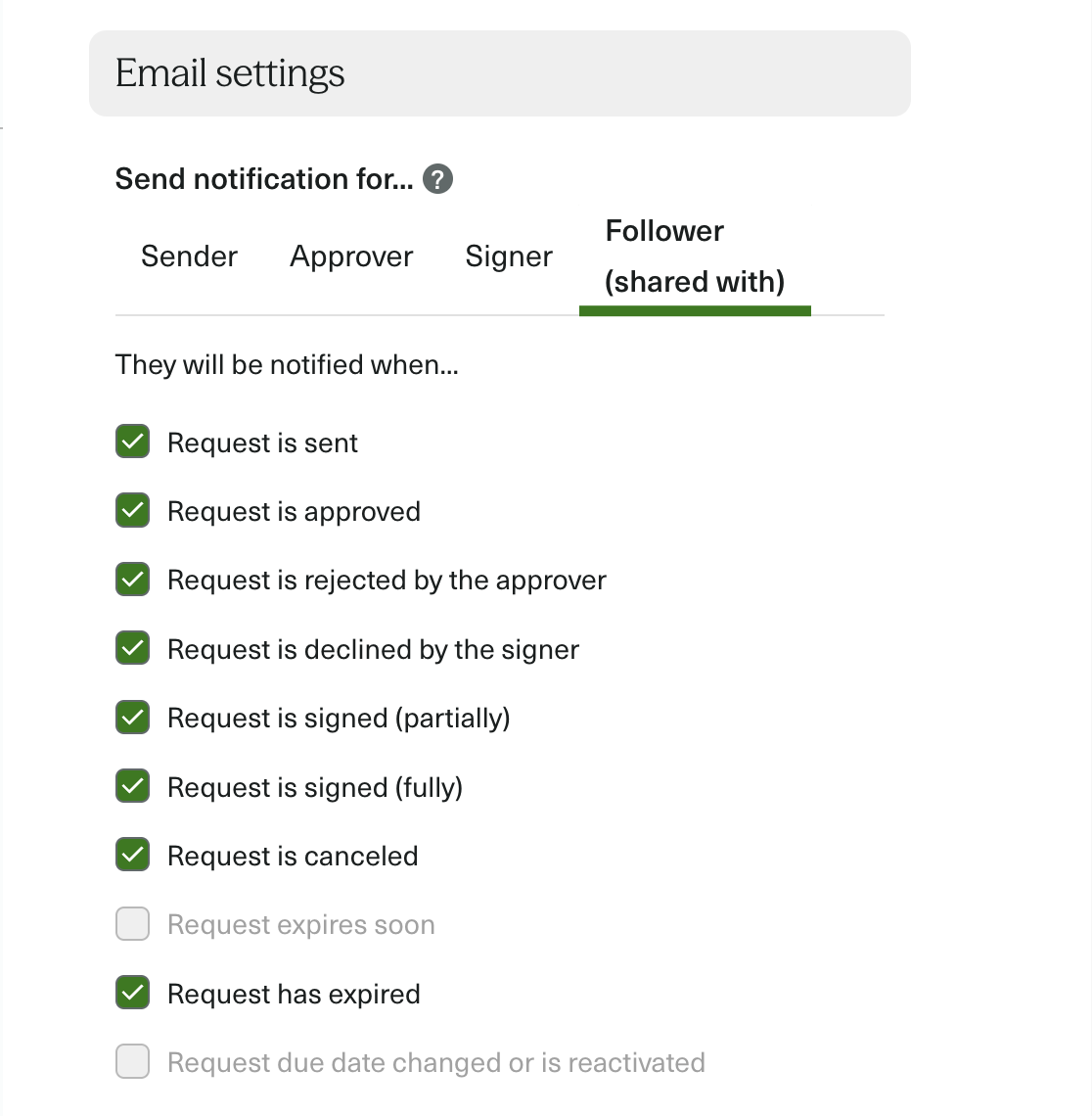 A Follower is a person with no action to take on the signature request (neither a Signer nor an Approver) who wishes to be notified by email when an event occurs on the Signature Request.