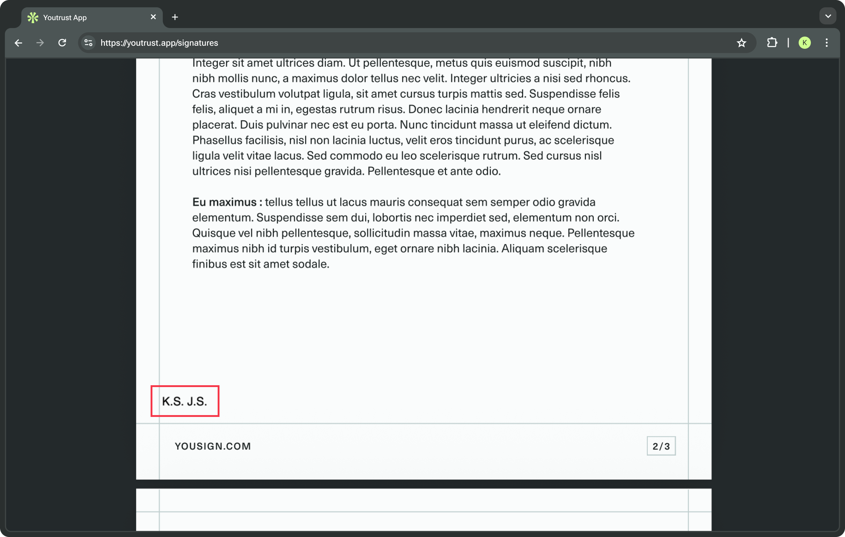 Initiales allow Signers to affix their Initiales on every page of a Document, ensuring compliance with legal or procedural requirements.