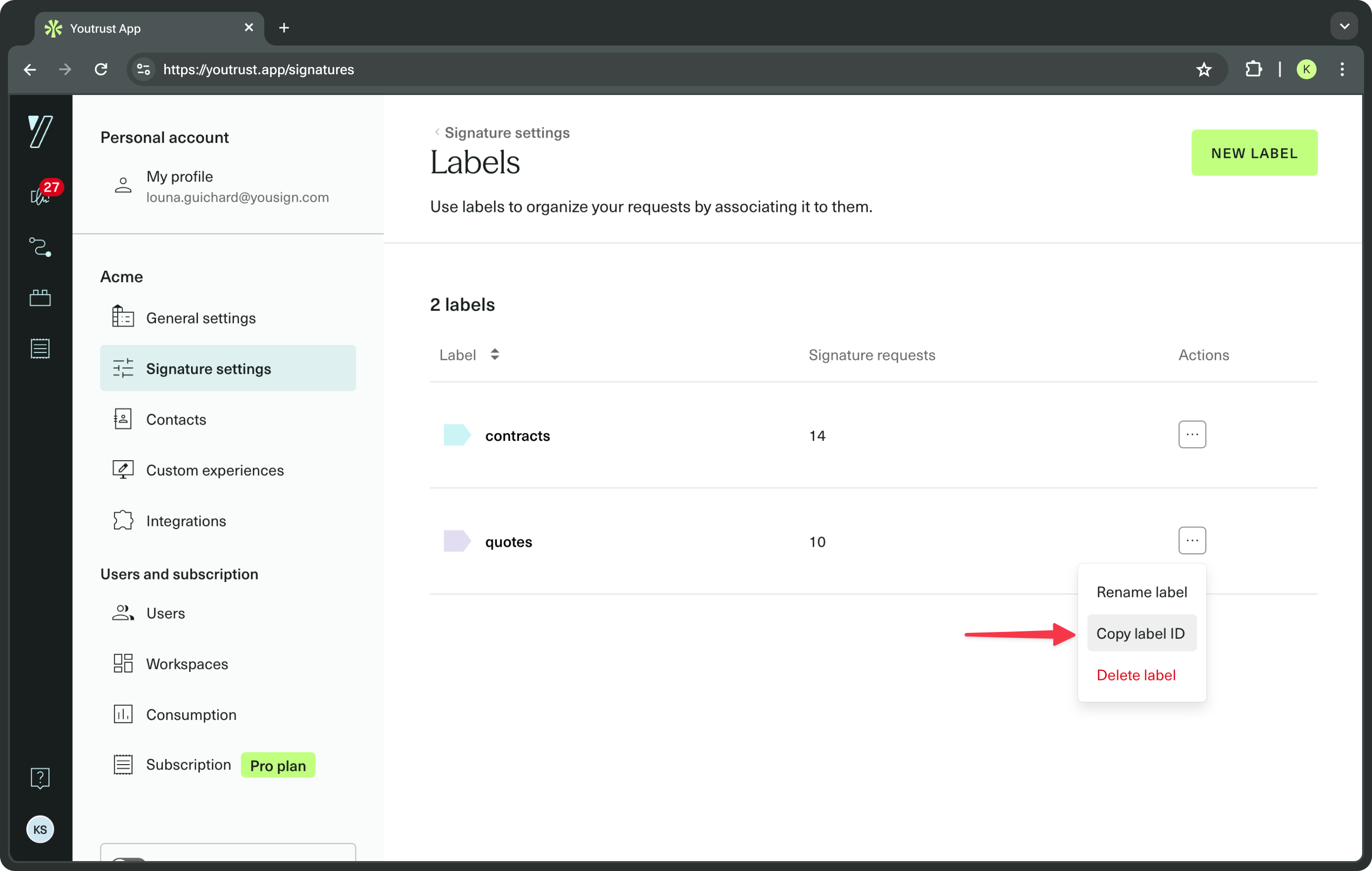 The Label resource designates a categorization tag that can be attached to a Signature Request. Labels make it easier to organize, filter, and find Signature Requests both in your Yousign app and via the API.