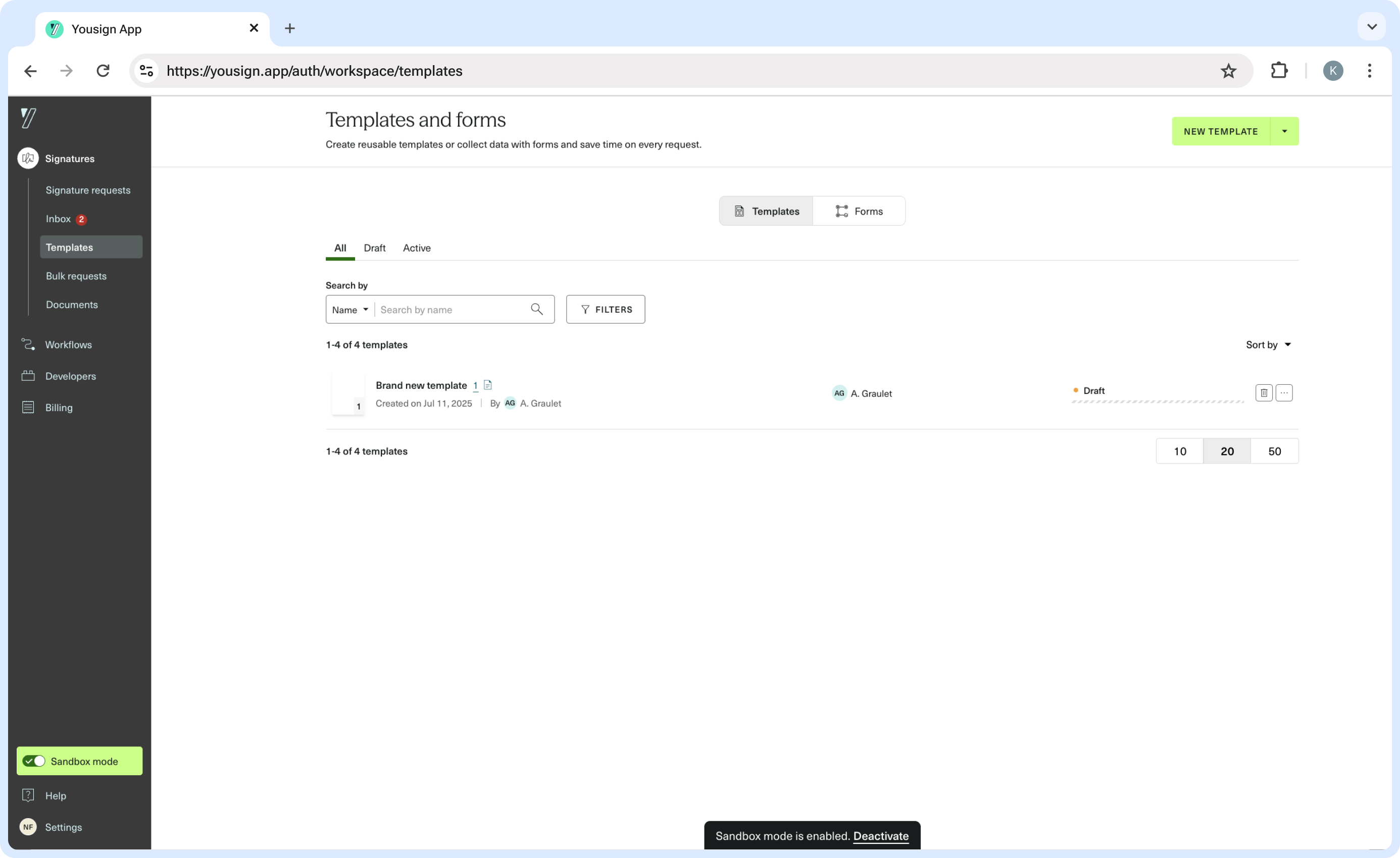 To create a Template, open the Template page of your Yousign Application. For a step‑by‑step walkthrough, see the Help Center article on creating Templates.
