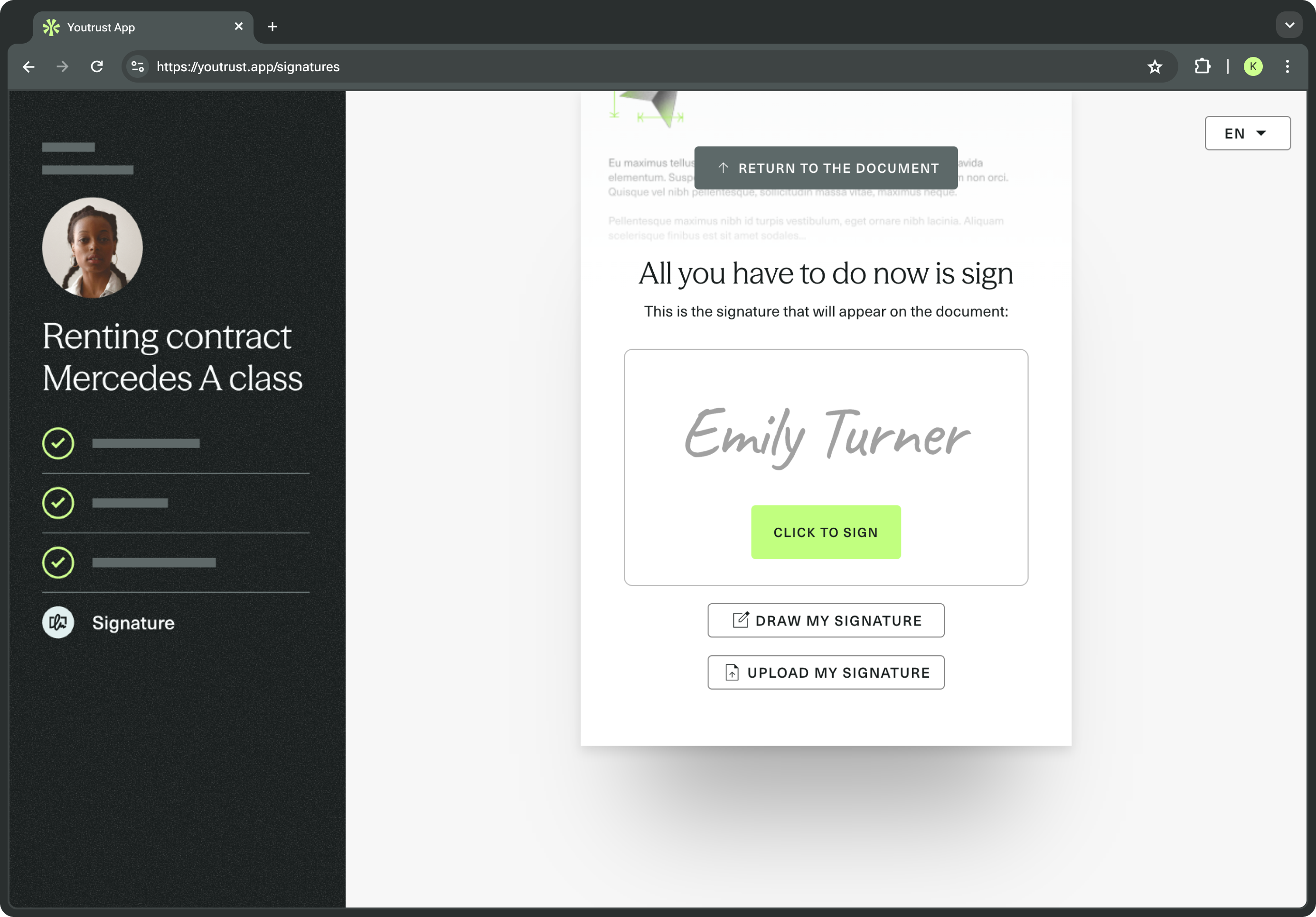 - Predesigned signature: this is the default option and the content of the signature will be pre-filled with the Signer name to ease the user experience.