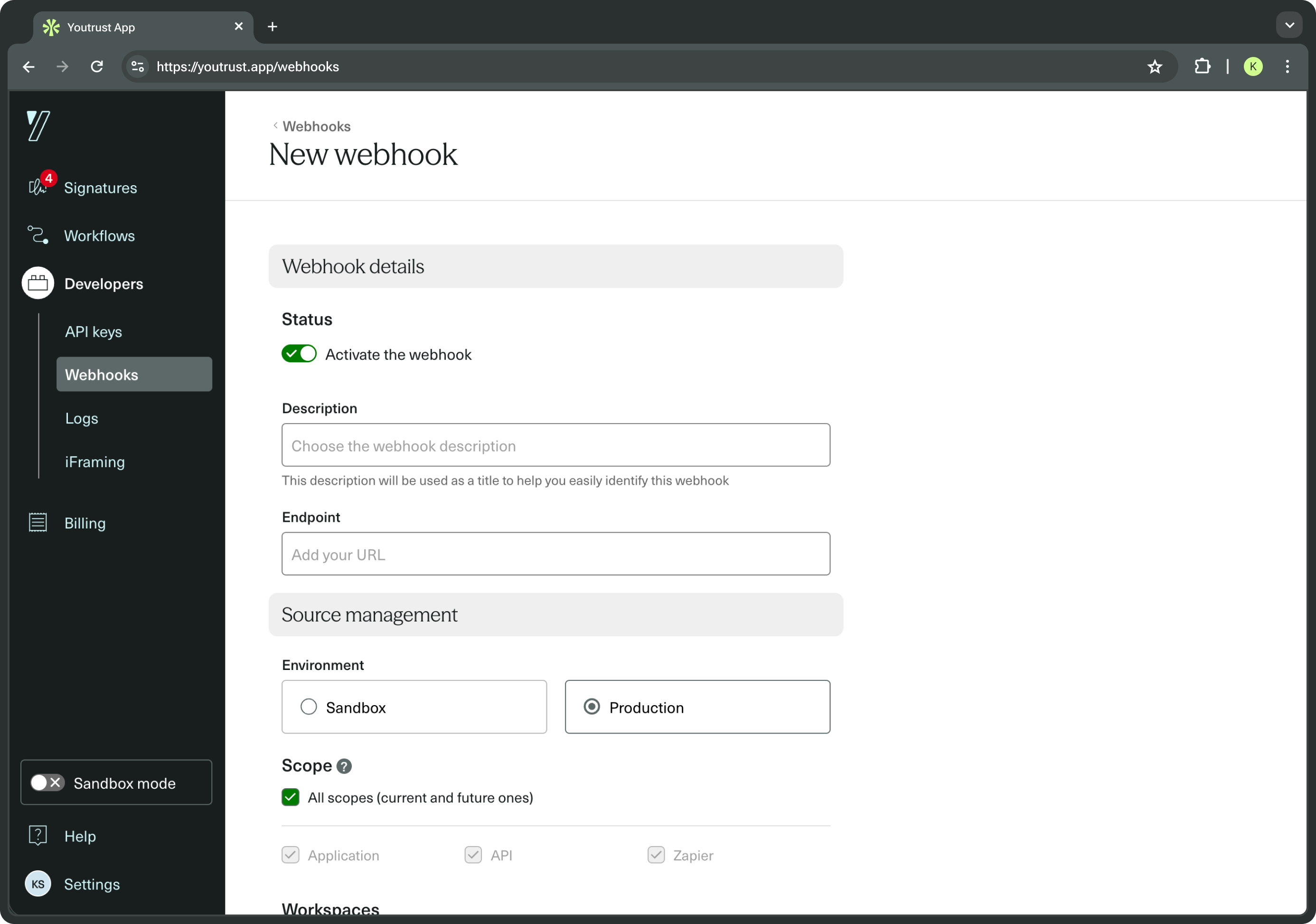 If your Yousign account uses multiple workspaces (e.g. by team, department, or region), you can restrict a webhook subscription to trigger only on specific ones.