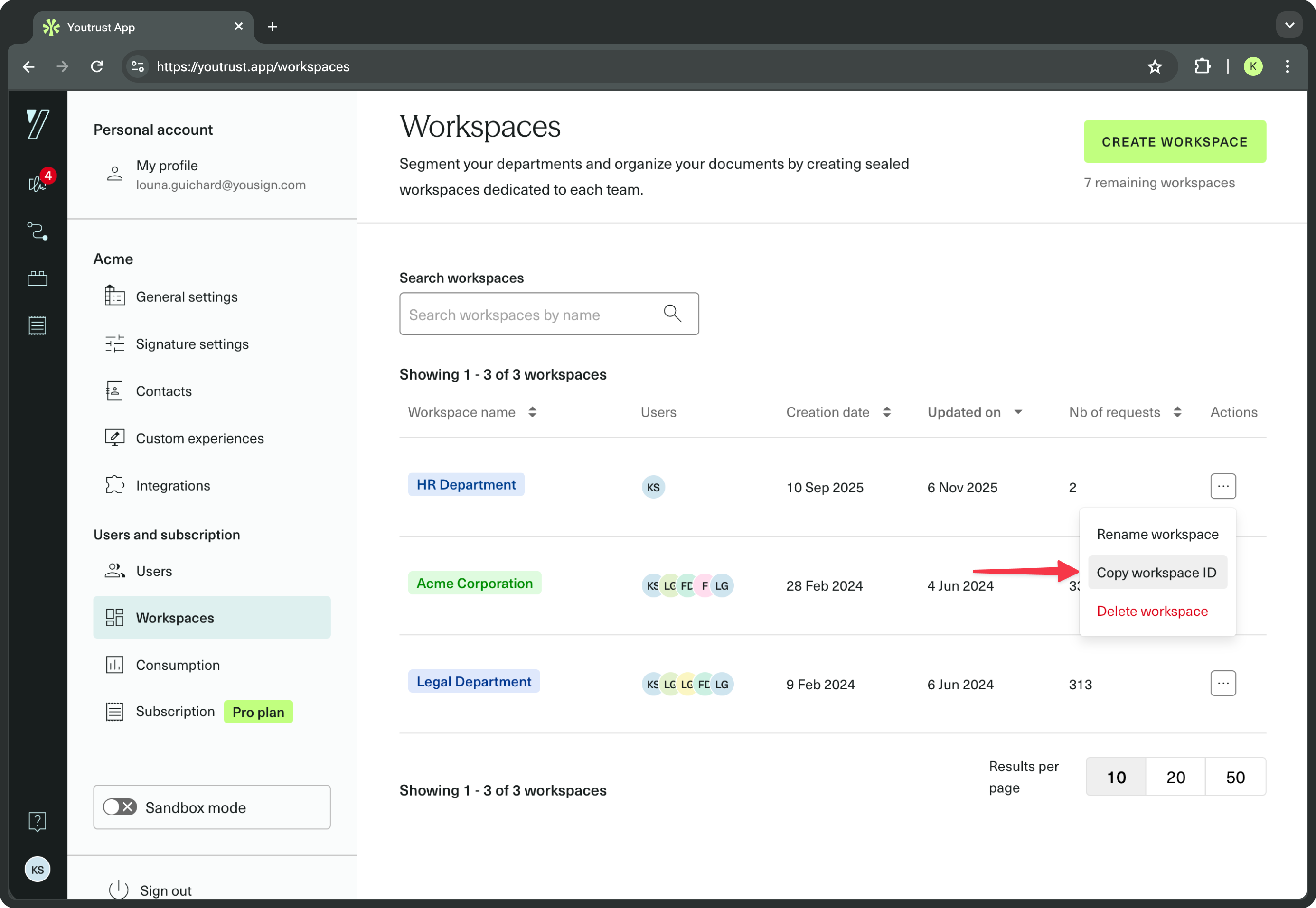 - Go to the Workspaces page : https://yousign.app/auth/settings/workspaces